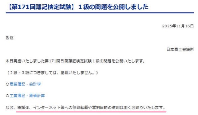 日商簿記1級の過去問は、日本商工会議所の公式サイトで確認できます。