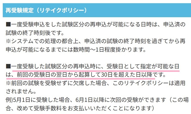 ・受験翌日の30日後の再受験が可能とのことなので