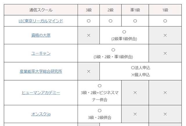 そこで、スクールごとの対応級が一目でわかる比較表と、各級におすすめの通信講座をまとめました▼