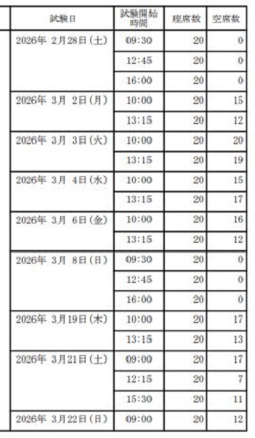 例えば、2026年3月2日(月)~3月8日(日)の一週間で5日間も試験が実施されていることがわかります。
