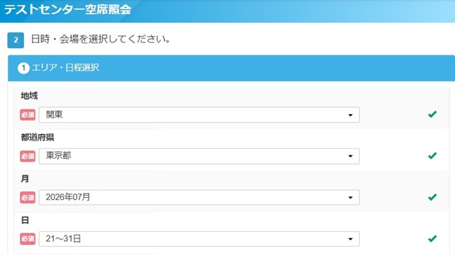 例えば、「東京都」「2026年7月21日~30日開催」「2級」と検索すると、このように会場がヒットするんです。